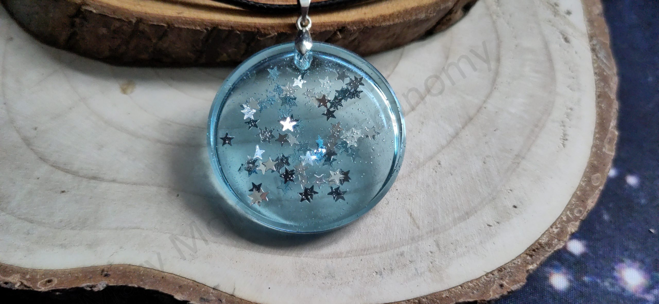 Add a touch of celestial charm to your look with this handmade round epoxy resin pendant featuring a transparent blue finish and floating silver star glitter. Lightweight, elegant, and perfect for everyday wear or gifting.
